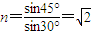 水面下一单色光源发出的一条光线射到水面的入射角为30°,从水面上射出时的折射角是45°,求:①水的折射率;