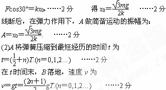 如图所示,A、B两物体的质量都为m,拉A物体的细线与水平方向的夹角为30°时处于静止状态,不考虑摩擦力,设弹簧的劲度系数为k.若悬线突然断开后,A在水平面上做周期为T的简谐运动,当B落地时,A恰好将弹簧压缩到最短,求:
