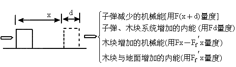 子弹对木块的作用力与木块对子弹的阻力是一对作用力和反作用力,其大小相等,设木块沿子弹运动方向的长度为 d,在子弹射穿过木块的过程中,木块位移为x,如图所示,则子弹对木块的作用力做功为Fx,子弹克服阻力做的功为F(x+d),所以A选项错;在这一过程中,还存在一对摩擦力做功,即木块对地面的摩擦力Ff与地面对木块的摩擦力