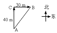 一位同学从操场中心出发,向北走了40m,到达C点,然后又向东走了30m,到达B点.用有向线段表明他第一次、第二次的位移和两次行走的合位移(即代表他的位置变化的最后结果的位移),三个位移的大小各是多少?由此可以得出什么结论?