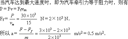 质量为2 t的汽车,发动机的牵动功率为30 kW,在水平公路上,能达到的最大速度为15 m/s,当汽车的速度为10 m/s时的加速度为