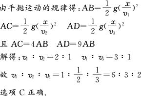 下图如图所示,用一只飞镖在O点对准前方的一块竖直挡板,O与A在同一水平线上,当飞镖的水平初速度分别为v1、v2、v3时,打在挡板上的位置分别为B、C、D,且AB∶BC∶CD=1∶3∶5,(不计空气阻力)则v1∶v2∶v3的值为