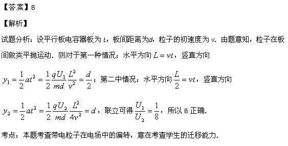 如图所示,有一带电粒子贴A板沿水平方向射入匀强电场,当偏转电压为U1时,带电粒子沿轨迹①从两板正中间飞出;当偏转电压为U2时,带电粒子沿轨迹②落到B板中间;设两次射入电场的水平速度相同,则电压U1 、U2之比为( )