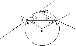 如图所示,在真空中波长为600 nm的激光束从A点射入圆柱形玻璃介质。若该激光束经折射后从B点射出,射出玻璃与射入玻璃的光线夹角为30°,AB孤所对的圆心角为120°,求该激光束在玻璃中的波长。