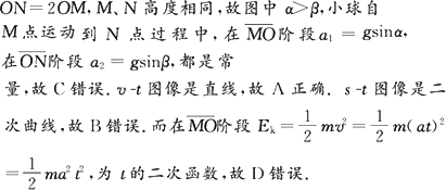 如图所示,光滑轨道MO和ON低端对接且ON=2MO,M、N两点高度相同.小球自M点由静止自由滚下,忽略小球经过O点时的机械能损失,以v、s、a、Ek分别表示小球的速度、位移、加速度和动能四个物理量的大小.下列图像中能正确反映小球自M点到N点运动过程的是