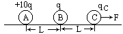 质量均为m的三个带电小球A、B、C从左向右依次放置在光滑绝缘的水平面上,彼此相隔的距离为L,A球带正电,电量QA=10q,B球带正电,电量QB=q,若在小球C上加一个水平向右的恒力F,要使A、B、C三球能始终保持L的间距运动,则外力F的大小和C球所带的电量为多少?