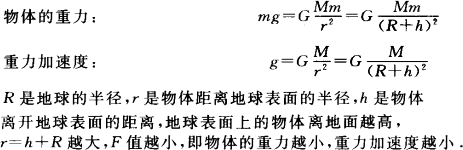 由于在两极时万有引力提供物体随地球一起转动的向心力f最小,在赤道时万有引力提供的向心力最大,而万有引力的大小不变,所以在两极时重力和万有引力大小最接近,在赤道时重力和万有引力相差最多. 实际上,由于地球的自转很慢,物体随地球的自转所需的向心力,最大也不过是地球对它的引力的千分之几;而且地球的极半径与赤道半径相差极小,物体的重力在两极与赤道相差也不过千分之几,所以在一般情况下,重力和重力加速度随纬度的变化可忽略不计,认为物体的重力等于地球对物体的引力.物体的重力和重力加速度会随着高度h的升高而减小. |
