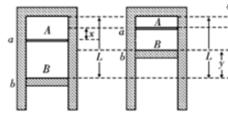 如图所示,竖直放置的气缸开口向下,活塞a和活塞b将长为L的气室中的气体分成体积比为1︰2的A、B两部分,温度均为127℃,系统处于平衡状态。当气体温度都缓慢地降到27℃时系统达到新的平衡,不计活塞a的厚度及活塞与气缸间的摩擦。求活塞a、b移动的距离。(设外界大气压强不变)