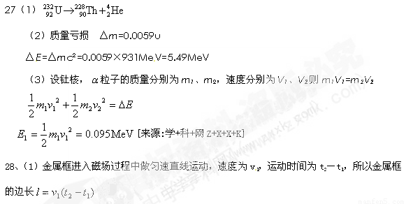 (3)假设反应中释放出的核能全部转化为钍核和α粒子的动能,则钍核获得的动能有多大?
