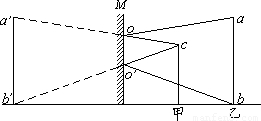 解:采用物像对应(虚线a′b′是乙ab的像)和边缘光线(c是甲的眼睛,aoc与bo′c是边缘光如线)作出甲能看到乙的像的光路图所示,则oo′为甲能看到镜中乙的全身像所需的最小镜面.在三角形ca′b′中根据相似性可得,oo′是ab的三分之一.