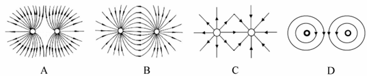 试题分析:根据常见的几种电荷电场线的分布特点,A图是等量同种电荷的电场线,B是等量异种的电荷的电场线,C是两个单独的点电荷的场线,D是两个单独点电荷的等势线,所以B正确。