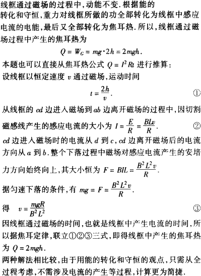 电阻为R的矩形线框abcd,边长ab=L,ad=h,质量为m,自某一高度自由落下,通过一匀强磁场,磁场方向垂直纸面向里,磁场区域的宽度为h,如图所示,若线框恰好以恒定速度通过磁场,线框中产生的焦耳热是________.(不考虑空气阻力)