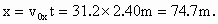 代入已知量,整理后可得 t=2.40s或1.28s.其中 t=1.28s是对应于B点的解,表示该球自由飞行至B点处所需时间.因此在本题中,应选解t=2.40s.在此飞行时间内,球的水平分速度不变,于是最后可得