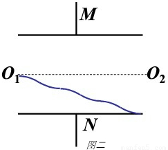 (2)粒子自O1点进入电场,做变加速曲线运动,最后恰好从N板的边缘平行飞出(如图二所示),设运动时间为t,则水平方向上有: