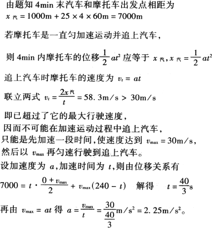本题限制条件较多,一是追上,二是4 min内,三是摩托车最大速度为108 km/h,解题中必须注意. |