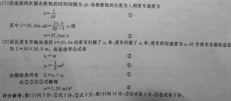 一客运列车匀速行驶,其车轮在铁轨间的接缝处会产生周期性撞击。坐在该客车中的某旅客测得从第1次到第16次撞击声之间的时间间隔为10.0s。在相邻的平行车道上有一列货车,当该旅客经过货车车尾时,货车恰好从静止开始以恒定加速度沿客车行进方向运动。该旅客在此后的20.0s内,看到恰好有30节货车车厢被他连续超过。已知每根铁轨的长度为25.0m,每节货车车厢的长度为16.0m,货车车厢间距忽略不计。求: