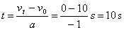 设汽车滑行时间t停止运动. 以初速v0 = 10 m/s方向为正方向,则vt = 0,a = -1m/s2,由速度公式有