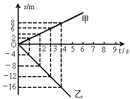 甲、乙两辆汽车,从同一位置沿同一直线分别做匀速直线运动.若汽车甲水平向右运动,速度为2m/s,而汽车乙水平向左运动,速度为4m/s,试在同一坐标系中画出两辆汽车的s-t图象.