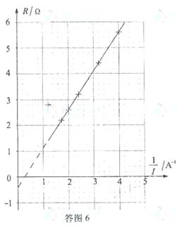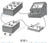 根据闭合电路欧姆定律,测量电源的电动势和内电阻,需要得到电源的路端电压和通过电源的电流,在本实验中没有电压表,但是可以用电阻箱和电流表串联充当电压表,测量电源的路端电压,通过电流表的电流也是通过电源的电流,所以只需要将电流表和电阻箱串联接在电源两端即可。实物图的连接如答图4所示。由闭合电路欧姆定律有: