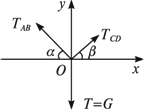 根据共点力平衡条件,有:TCDcosβ-TABcosα=0 ① TCDsinβ+TABsinα-G=0 ② 由式①解得TAB= 讨论:(1)当TCD=4 N时,TAB= (2)当TAB=5 N时,TCD= |