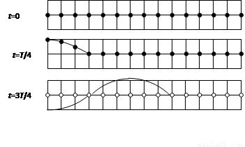 (1)(3分)细绳的一端在外力作用下从t =0时刻开始做简谐运动,激发出一列简谐横波。在细绳上选取15个点,图中第一个图为t =0时刻各点所处的位置,图中第二个图为t =T/4时刻的波形图(T为波的周期)。在图中第三个图中画出t =3T/4时刻的波形图。