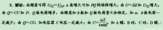 如图8所示,C为中间插有电介质的电容器,a和b为其两极板,a板接地;P和Q为两竖直放置的平行金属板,在两板间用绝缘线悬挂一带电小球;P板与b板用导线相连,Q板接地.开始时悬线静止在竖直方向,在b板带电后,悬线偏转了角度α.在以下方法中,能使悬线的偏角α变大的是( ) ![]()