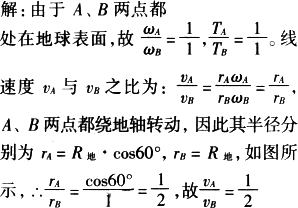 在地球表面上选取A、B两点,A点位于北纬60°处,B点位于赤道上,则A、B两点的角速度之比为________,线速度之比为________,周期之比为________.