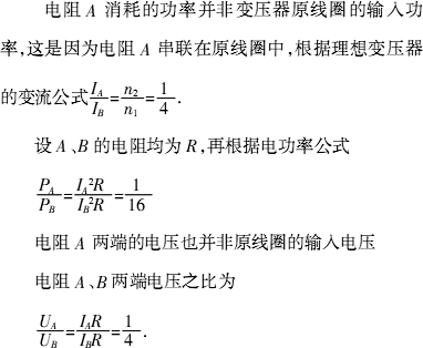 n1∶n2=4∶1,原线圈回路中的电阻A与副线圈回路中的负载电阻B的阻值相等.a、b端加一定交变电压后,两电阻的电功率之比PA∶PB=________,两电阻两端电压之比UA∶UB=________.