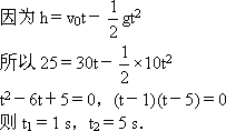 一物体做竖直上抛运动(不计空气阻力),初速度为30 m/s,当它的位移为25 m时,经历时间为(取g=10 m/s2)