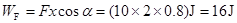 (8分)如图所示,质量为m=1kg的物体在与水平方向成α=37°的拉力F=10N的作用下,在动摩擦因数为μ=0.2的水平面上发生了一段位移x=2m,求:(g=10m/s2,sin37°=0.6,cos37°=0.8)