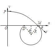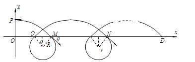 (2)粒子在第二次经过x轴时到达D点,其轨迹如图所示。设粒子进入磁场的速度大小为v,v与x轴的夹角为θ,轨迹半径为R,则![]()