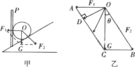 球所受的重力使球产生两个作用效果:一是对挡板造成压力,二是对斜面造成压力,因此可作出图甲所示的分解重力的平行四边形. 当P转到不同位置时,同上分析将有不同的分解重力的平行四边形与之对应.在所有这些平行四边形中,重力G(合力)的大小和方向不变,分力F2的方向不变(总与斜面垂直),分力F1的大小和方向都发生变化.由于要构成平行四边形这一条件的限制,表示不同情况下分力F1的线段的末端点应落在图乙中的虚线AC上(AC过表示重力G的线段OC的末端且与斜面垂直).这些线段中最短的就表示分力F1对应的值最小. 由图乙可知,这些线段中最短的是OD(OD⊥AC).在直角三角形OCD中 OD=OC·sinθ 因此分力F1的最小值 F1=Gsinθ 这个值就是球对挡板压力的最小值. |