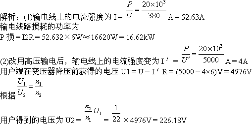 (2)若改用5000 V高压输电,用户端利用n1∶n2=22∶1的变压器降压,求用户得到的电压.