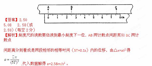 (2013山东寿光市质检)如图是物体做匀变速直线运动纸带的一部分,已知所用打点计时器的周期T=0.02s,A、B、C分别是三个记数点,每两个记数点间有四个记时点未画出,纸带下方是一把毫米刻度尺。则由纸带和刻度尺可知:A与B之间的距离为 cm,B与C之间的距离为 cm,该匀变速直线运动的加速度是a= m/s2。