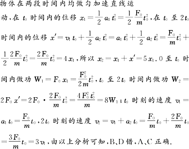 一物体在外力的作用下从静止开始做直线运动,合外力方向不变,大小随时间的变化如图所示.设该物体在t0和2t0时刻相对于出发点的位移分别是x1和x2,速度分别是v1和v2,合外力从开始至t0时刻做的功是W1,从t0至2t0时刻做的功是W2,则