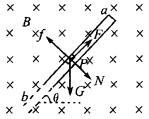如图所示,有沿斜向固定的足够长的绝缘管道ab,其倾角为q .管道内有一个质量为m带负电的小圆柱体P,所带电量的绝对值为q.P的横截面直径略小于管道的内径,它与管壁之间的动摩擦因数为m .整个装置处于磁感应强度为B的匀强磁场中,磁场方向垂直管道而远离读者(即垂直纸面向里).小圆柱体P从管道内的顶部由静止释放后将沿管道下滑,试求P下滑的最大速度(设P所带电量保持不变).![]()