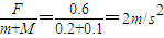 解答:解:由于动摩擦因数为0.5,静摩擦力能提供的最大加速度为5m/s2,所以当0.6N的恒力作用于木板时,系统一起以a=