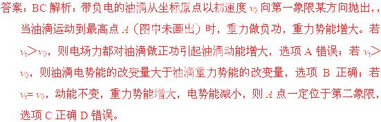 (浙江省2012年2月四校联考)如图所示,在水平向右的匀强电场中以竖直和水平方向建立直角坐标系,一带负电的油滴从坐标原点以初速度v0向第一象限某方向抛出,当油滴运动到最高点A(图中未画出)时速度为vt,试从做功与能量转化角度分析此过程,下列说法正确的是: