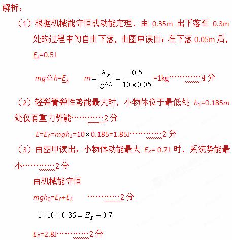 (2013上海市嘉定区期末)如图a所示,竖直光滑杆固定不动,上面套有下端接触地面的轻弹簧和一个小物体。将小物体在一定高度静止释放,通过传感器测量到小物体的速度和离地高度h并做出其动能-高度图b。其中高度从0.35m下降到0.3m范围内图像为直线,其余部分为曲线。以地面为零势能面,根据图像求: