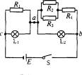 若R3短路或R4短路,总外电阻减小,总电流增大,a中电流变大,与题意相矛盾,故C、D选项错,正确选项只有A. 答案:A 说明:(1)分析较复杂的电路时,画出简化的等效电路是非常必要的,这有助于分析思考,不至出错. (2)由故障现象,根据电路原理分析判断故障原因,这也是一类常见的题目.判断故障时除要观察一些表面易见的现象外,还常需要进行测量,如测量电压、电流、电阻等,得到一些数据,然后由数据结合电路原理进行分析判断.这就和医生诊断病情一样,除了“望、闻”之外还要“问、切”,必要时还要使用仪器进行检查测量.
