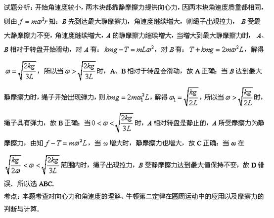 如图所示,两个可视为质点的、相同的木块A和B放在转盘上,两者用长为L的细绳连接,木块与转盘的最大静摩擦力均为各自重力的K倍, A放在距离转轴L处,整个装置能绕通过转盘中心的转轴O1O2转动。开始时,绳恰好伸直但无弹力,现让该装置从静止开始转动,使角速度缓慢增大,以下说法正确的是:( )