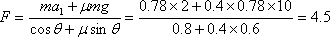 (1)Fcosθ-μN=ma1 N+Fsinθ=mg 解得: (2)匀加速阶段: 匀减速阶段初速度:v=a1t1=2×3=6 m/s a2=μg=0.4×10=4 m/s2 匀减速时间: 匀减速阶段位移: 物体在5 s内滑行的总位移:s=s1+s2=9+4.5=13.5 m