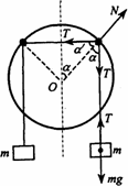 对于重物m,受绳子拉力T与重力mg作用,有T=mg,对于小圆环,受到三个力的作用,水平绳子的拉力T、竖直绳子的拉力T、大圆环的支持力N.两绳子的拉力沿大圆环切向的分力大小相等,方向相反T sinα=T sinα′,得α=α′,而α+α′=90°,所以α=45°. |