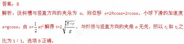 (2013安徽省江南十校联考)如图所示,AB和CD是两条光滑斜槽,它们各自的两端分别位于半径为R和r的两个相切的竖直圆上,并且斜槽都通过切点P。有一个小球由静止开始分别沿斜槽从A滑到B和从C滑到D,所用时间分别为t1和t2,则t1和
