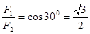 将四块相同的坚固石块垒成圆弧形的石拱,其中第3、4块固定在地基上,第l、2块间的接触面是竖直的,每块石块的两个侧面间所夹的圆心角均为30°。假定石块间的摩擦力可以忽略不计,则第1、2块石块间的作用力F1和第1、3块石块间的作用力F2的大小之比为 ( )