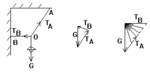 解: 如图, 结点O受三力作用而平衡. 三力F=G、TA、TB构成一封闭矢量三角形. 随着B点上移, 矢量G大小、方向均不变, 矢量TA方向不变、大小变,矢量TB方向、大小均变. 从图可以看出, 当TB与TA垂直时其值最小.所以, 随着B点上移, 绳子OB的拉力先减小后增大.