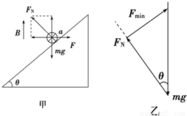 如图乙所示,由力的矢量三角形讨论可知,当安培力方向与支持力垂直时,安培力最小,对应磁感应强度最小,设其值为Bmin,则: