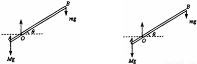 一足够长的斜面,最高点为O点,有一长为l=1.00m的木条AB,A端在斜面上,B端伸出斜面外.斜面与木条间的摩擦力足够大,以致木条不会在斜面上滑动.在木条A端固定一个质量为M=2.00kg的重物(可视为质点),B端悬挂一个质量为m=0.50kg的重物.若要使木条不脱离斜面,在下列两种情况下,OA的长度各需满足什么条件?(Ⅰ)木条的质量可以忽略不计.
