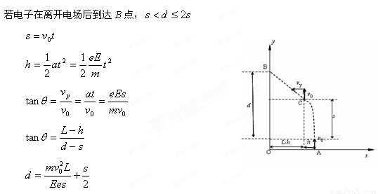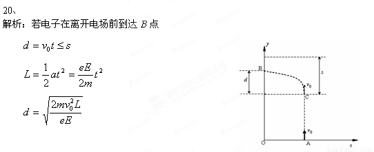 如图所示,一束电子从x轴上的A点以平行于y轴的方向射入第一象限区域,射入的速度为v0,电子质量为m,电荷量为e.为了使电子束通过y轴上的B点,可在第一象限的某区域加一个沿x轴正方向的匀强电场,此电场的电场强度为E,电场区域沿x轴方向为无限长,沿y轴方向的宽度为s,且已知OA=L,OB=2s,求该电场的下边界与B点的距离。