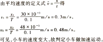用接在50 Hz交流电源上的打点计时器,测定小车的运动情况.某次实验中得到一条纸带如图所示,从比较清晰的点起,每五个打印点取一个记数点,分别标明0、1、2、3…,量得0与1两点间距离x1=30 mm,2与3两点间的距离x3=48 mm,则小车在0与1两点间平均速度为v1=________m/s,在2与3两点间的平均速度v2=________m/s,据此可判定小车做________.